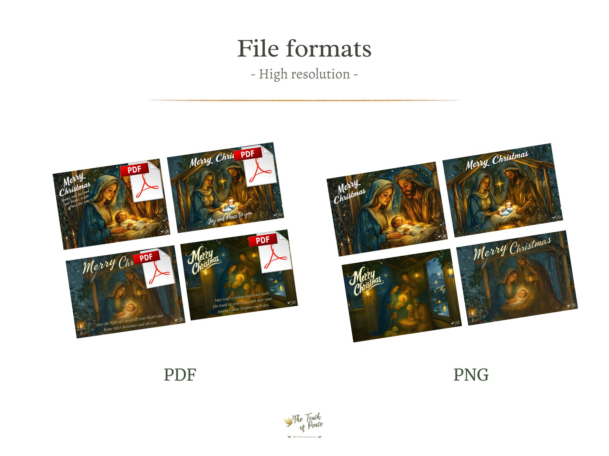 Share the true meaning of Christmas with this faith-inspired Nativity card bundle. This set includes 8 printable Christmas cards, thoughtfully designed to offer both message-ready and blank options.